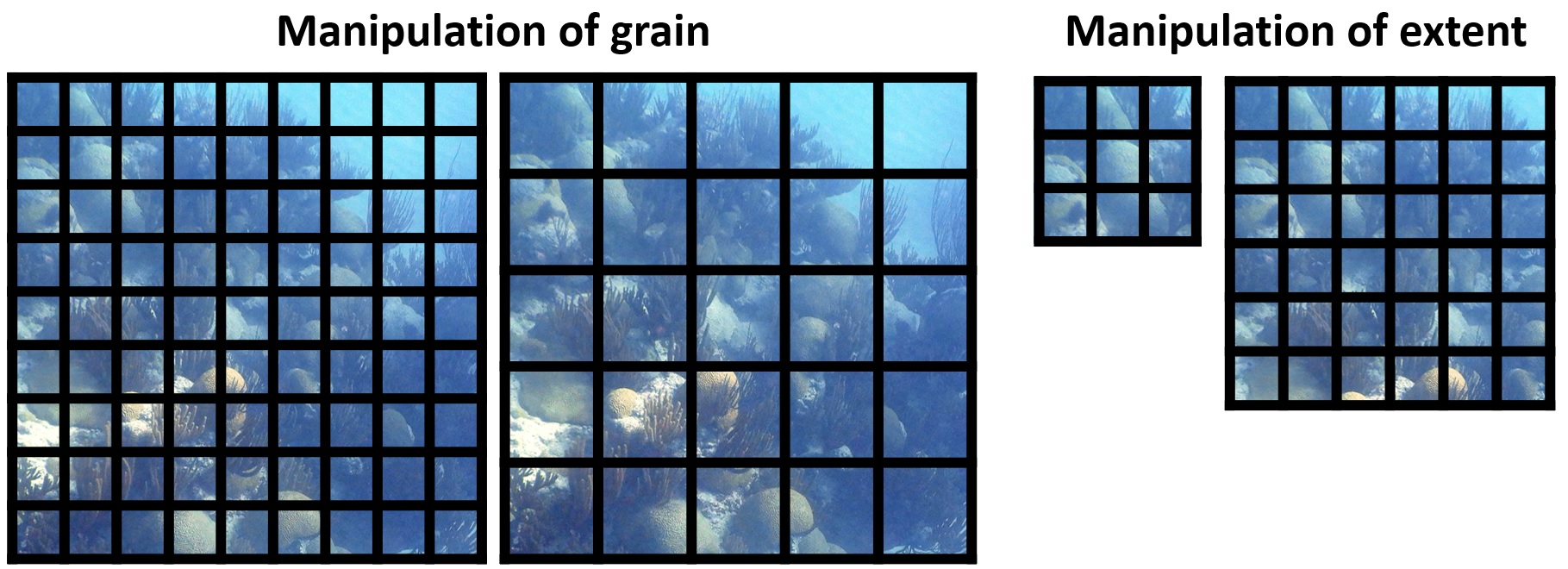 Scale sets the resolution under which we look at the world. The scale consists of two components: grain and extent. Grain sets the unit of observation. For an ecologist, it can be a quadrat, which they use to make observations; for a photographer, it is a pixel, which, combined with many others, comprise the whole picture. Extent is an area over which our observations are done. To stick to the original examples, for an ecologist, it would be the area between two furthermost quadrats; for a photographer, it would be set by the boundaries of the final picture. Both grain and extent can be manipulated. Here are two examples of hypothetical study grids. While the first one changes the grain of observation, keeping the extent same, the second keeps the same grain while changing the extent.
