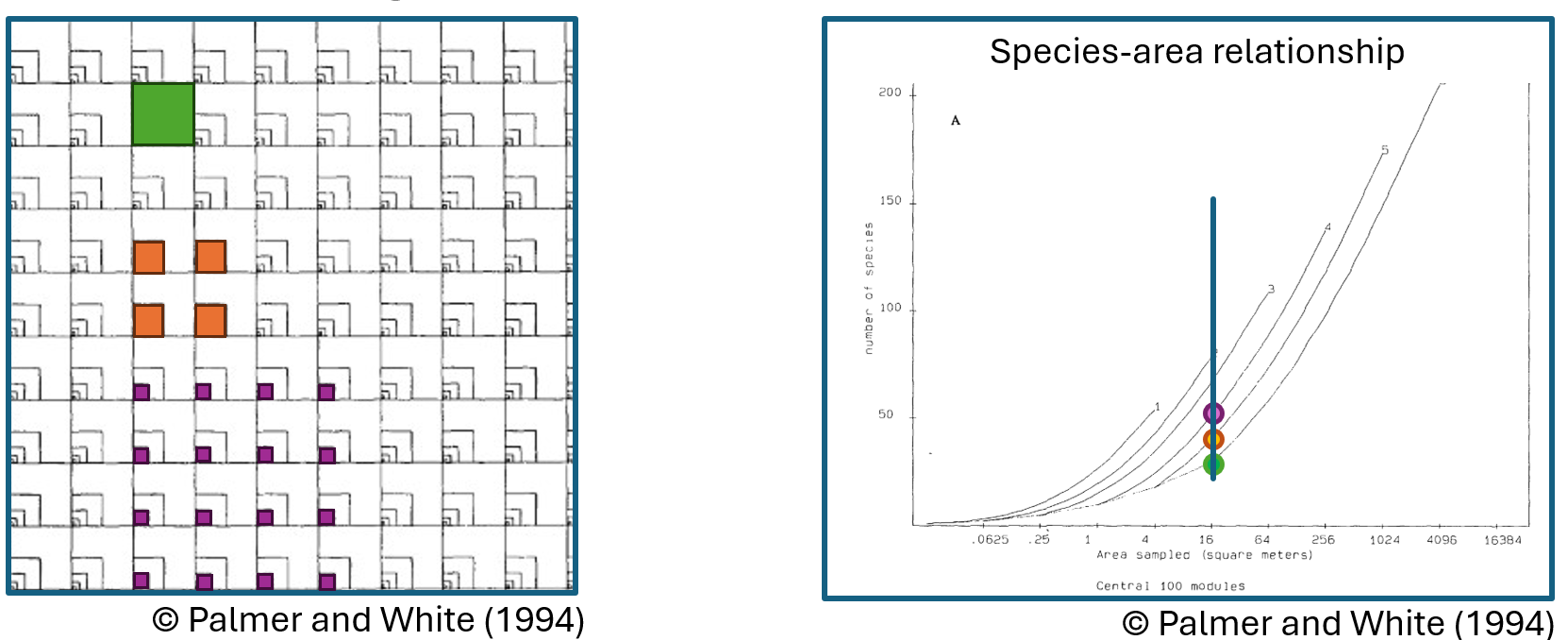 While this may seem trivial, researchers often forget that the grain and extent of observation can vastly change our results, even for such a substantial relationship as the one between area and number of observed species. This was proven in 1994 by Palmer and White in a study with a great observational experiment taking place in a forest in North Carolina. They sampled vascular plants using a special grid of nested quadrats. The quadrats of different sizes, therefore different grains, were called different levels. To sample an area of a given size, e.g. 16 square meters, one can sample one quadrat of level 6 (highest level), 4 quadrats of level 5, 16 quadrats of level 4, etc. As the quadrats of smaller levels are nested to the bottom left corners of the bigger ones, incorporating more of them also means spacing them further apart, to a bigger extent.